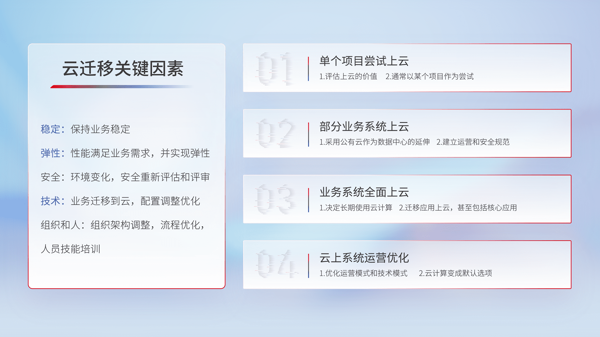 结合实际业务,,,,从规划设计、、、、云平台选型、、、云原生改造、、数据迁移、、、集成交付,,,迁移全过程为客户识别最佳上云路径,,做好风险识别管理,,,设计网络架构、、、、身份权限、、、、安全审计合规、、、、操作审计、、日志审计、、监控告警策略、、、、多站点容灾设计等,,,,对云上基础设施进行整体规划,,提升IT治理水平,,以满足弹性、、高可用、、、、高性能的需求。。。