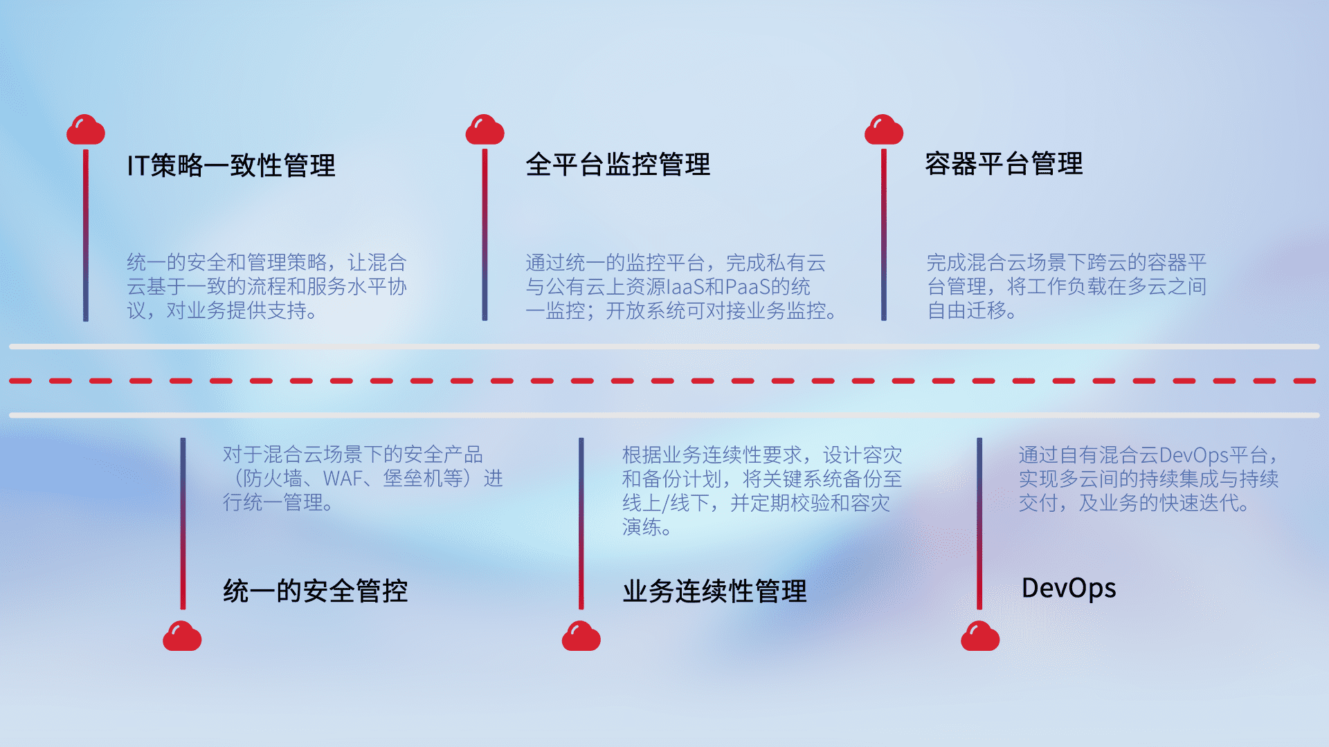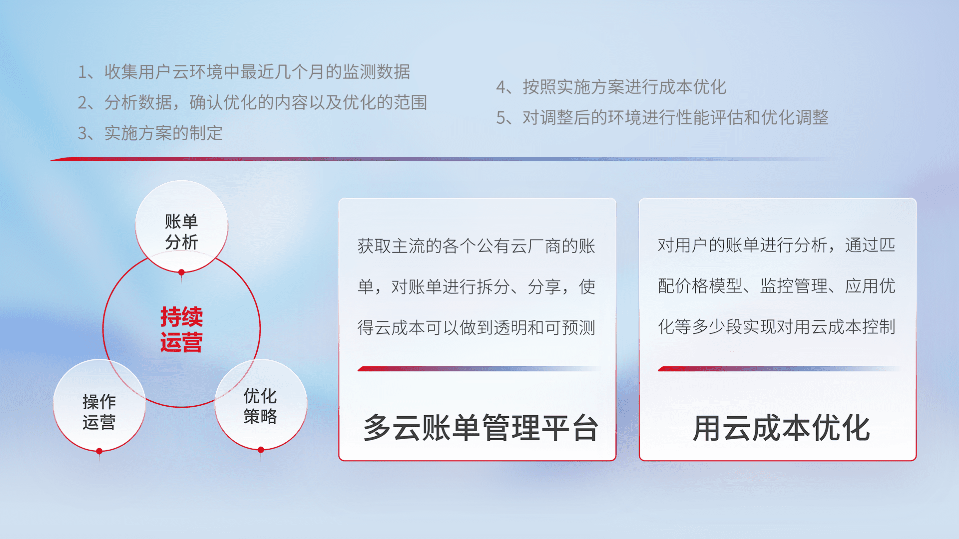 通过多云纳管,,,以统一的资源数据模型把客户的云资源进行抽象和封装,,,进而实现对多云资源的统一操作,,,保障云资源管理的可靠性、、稳定性与可用性。。。量身定制化运维内容,,,配置、、、开发运维、、补丁管理、、备份、、、、监控、、、、认证和访问管理、、审计和日常巡检等,,保障在用云过程中的可靠度,,稳定度以及高可用率。。。。