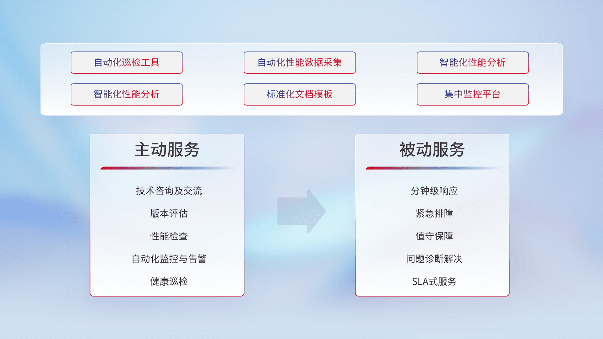 智能化工具和标准化文档,,,,保障服务质量,,提供主动服务(包含技术咨询、、版本评估、、、、性能检查、、、、自动化监控与告警、、、、健康巡检)和被动服务包含(分钟级响应、、紧急排障、、、值守保障、、、、问题诊断解决、、SLA服务)。。。